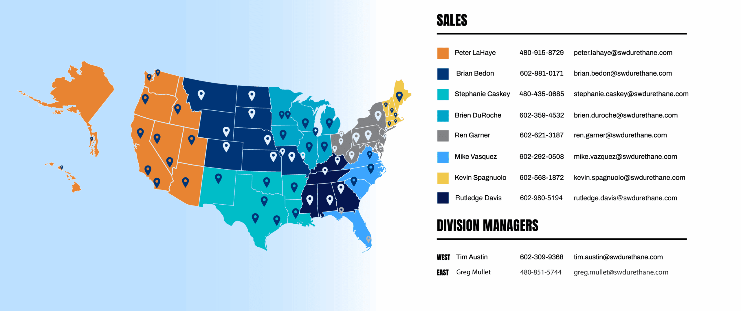 Looking to get started with SWD? Use the map below to connect with your local sales rep. Whether you’re new to spray foam or ready to take the next step, our team is here to help – with product answers, pricing, and real support from people who know the job. We’re ready when you are.